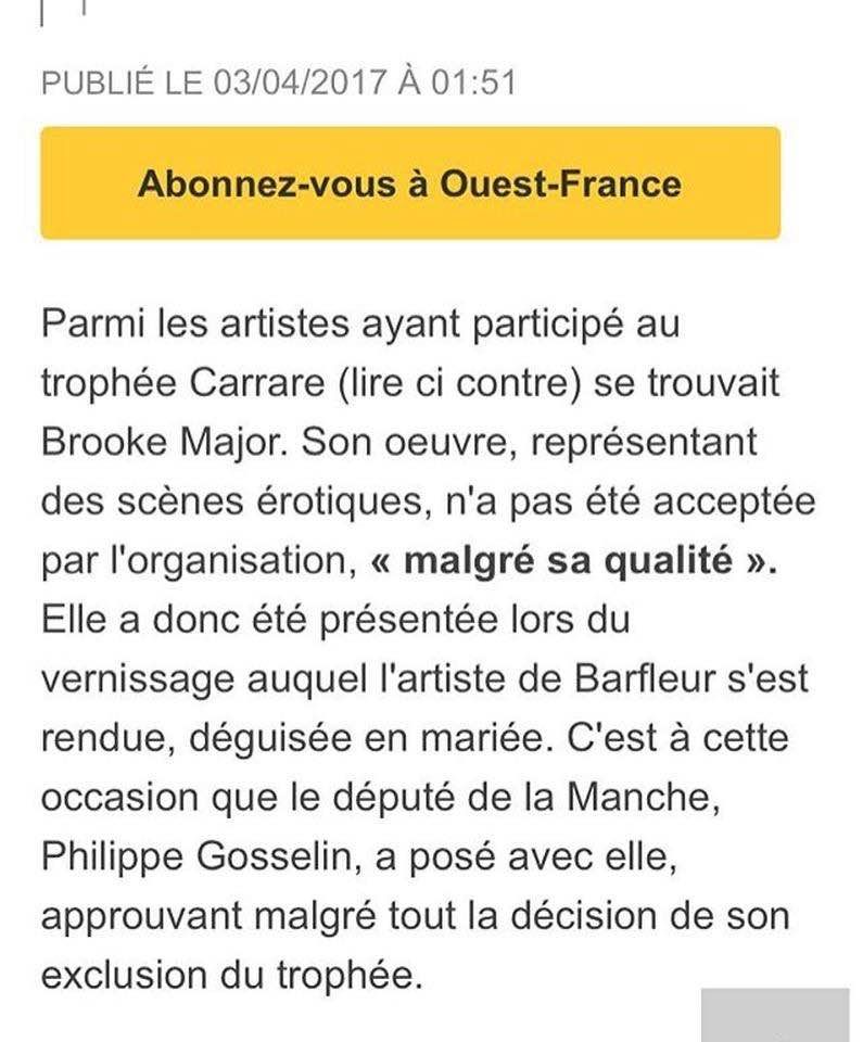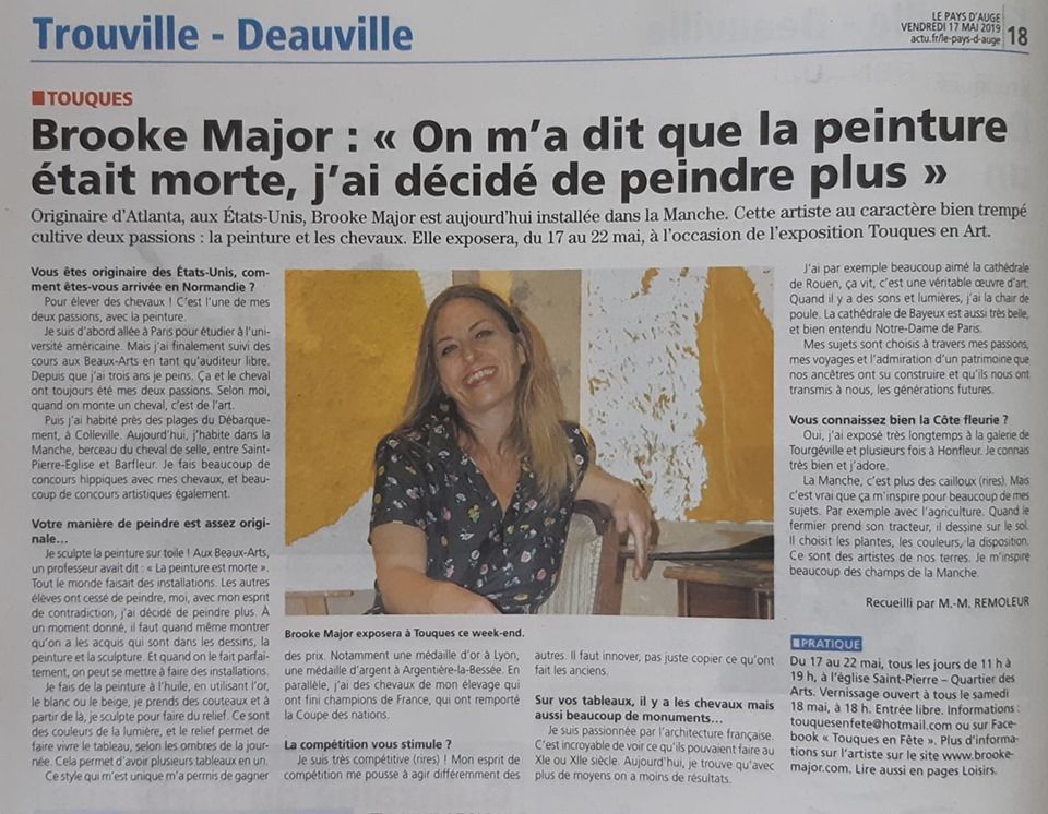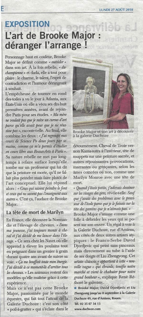 Les spectateurs présents au vernissage de l'exposition de Brooke Major, samedi, ont pu être surpris par l'artiste, qui s'était déguisée en princesse pour l'occasion. « Et pourquoi pas ? » a-t-elle répondu, lorsqu'on l'a interrogée sur ce choix. L'Américaine n'est plus à une excentricité près dans son parcours. Un parcours qui l'a vue passer par les beaux-arts à Paris, puis Atlanta (sa ville d'origine) et le haras du Martinvast (Manche), dont elle a été pendant cinq ans la directrice.