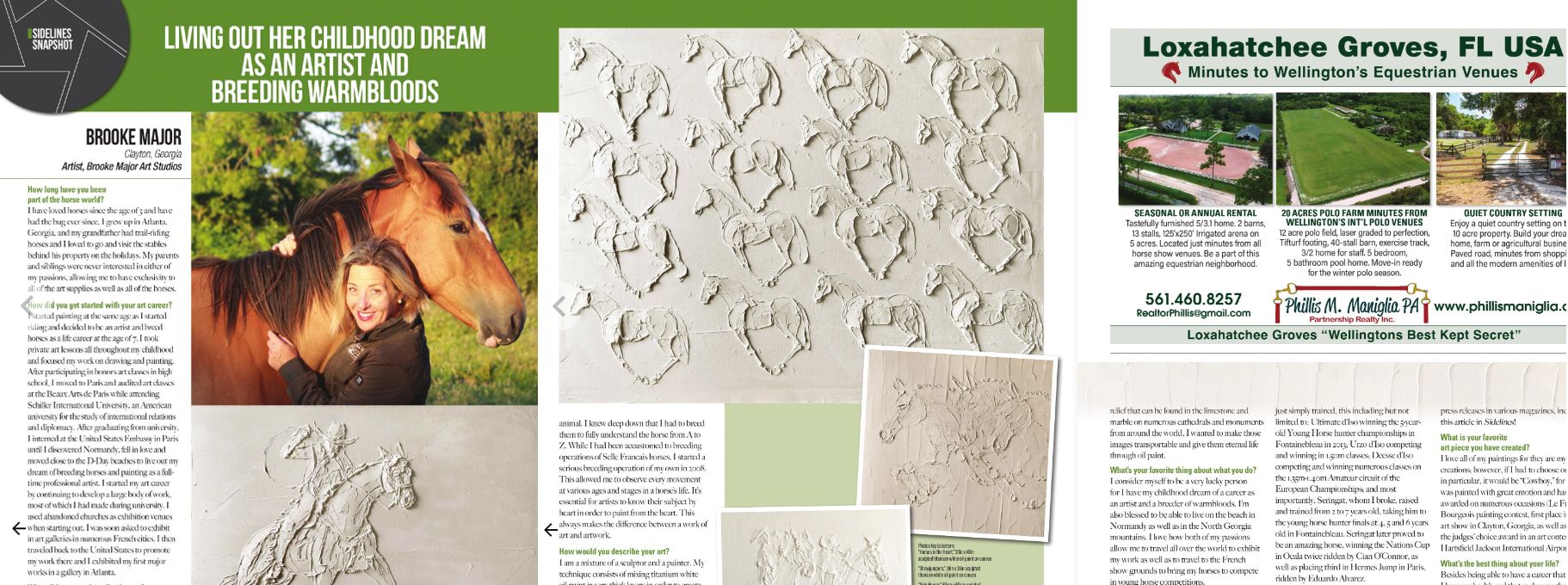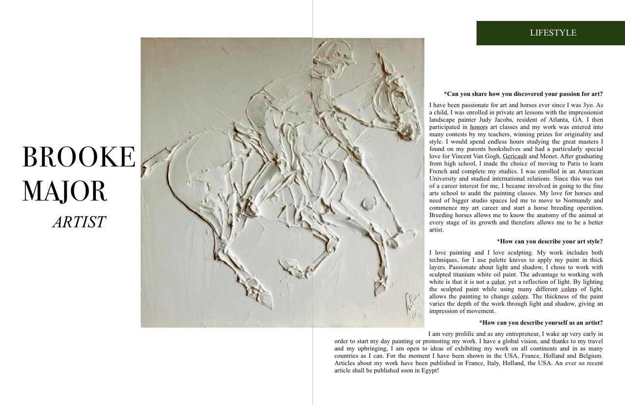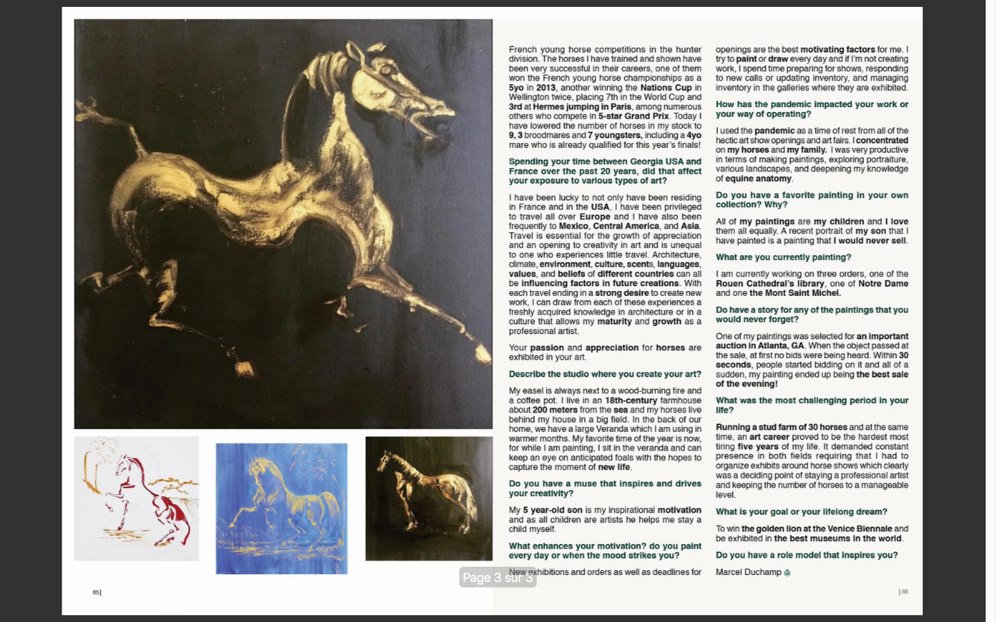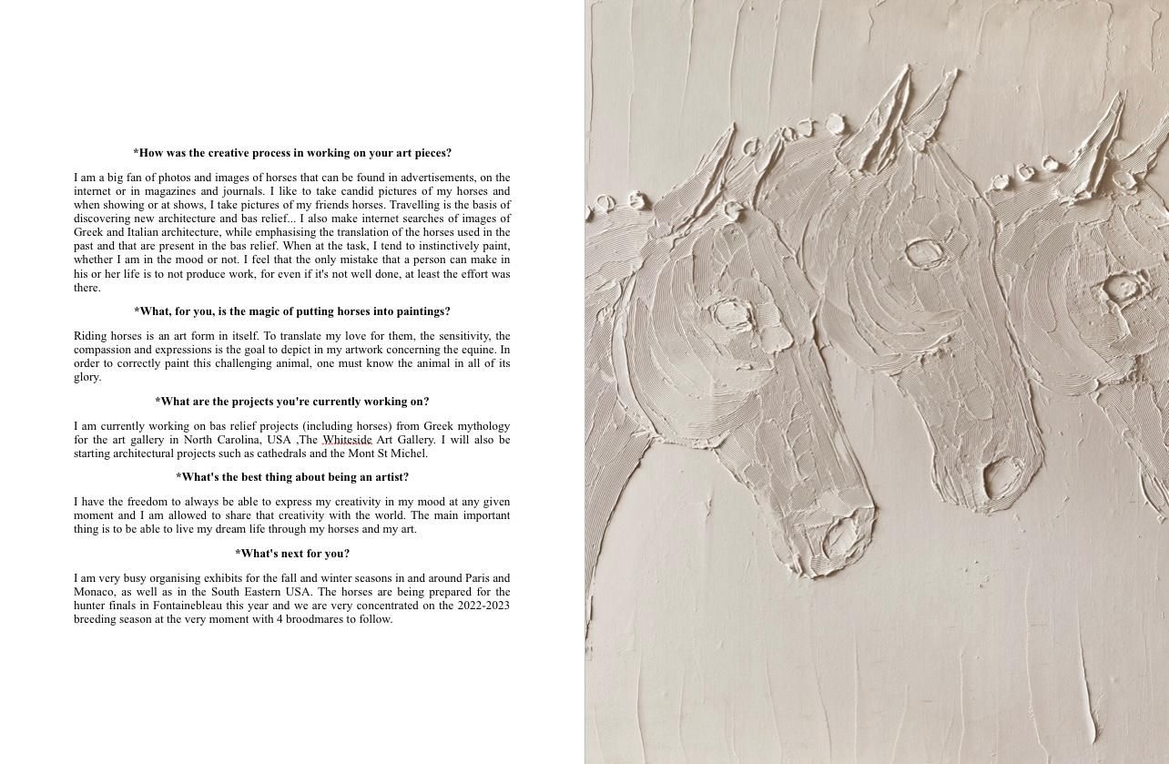 Ses peintures d'équidés, qui confinent à la sculpture par le relief que l'artiste leur donne, lui ont demandé six mois de travail. « Je voulais que ce soit parfait », lâche-t-elle. Arrivée en France il y a 17 ans, celle qui voulait être éleveuse depuis qu'elle avait trois ans a aujourd'hui atteint son but. « Ma mère ne voulait pas que je sois artiste, donc j'ai fait Sciences Po Paris. Mais je voulais faire des tableaux et des chevaux », confie-t-elle.