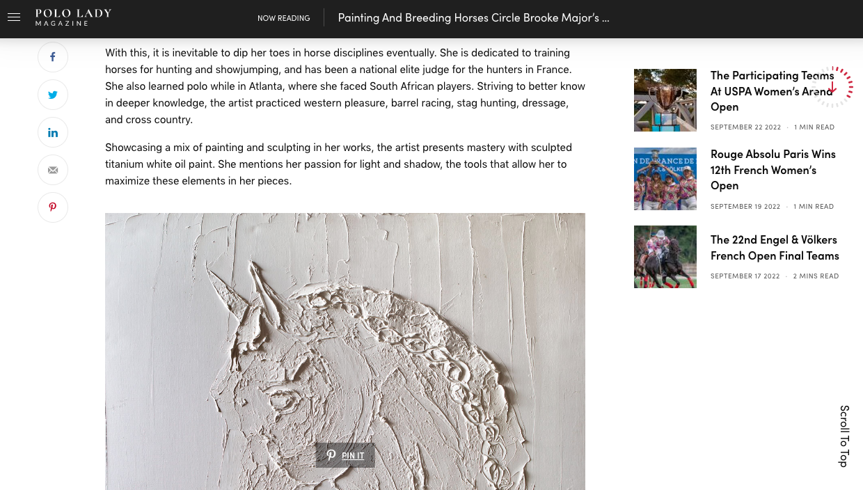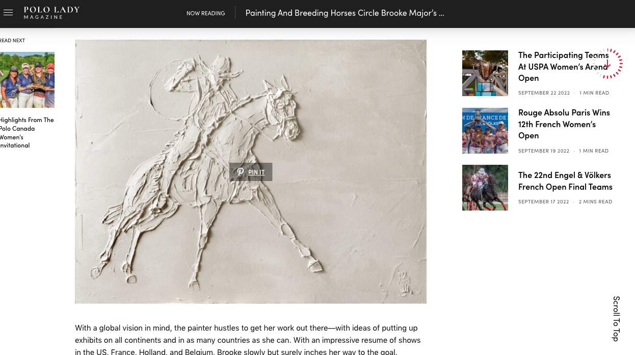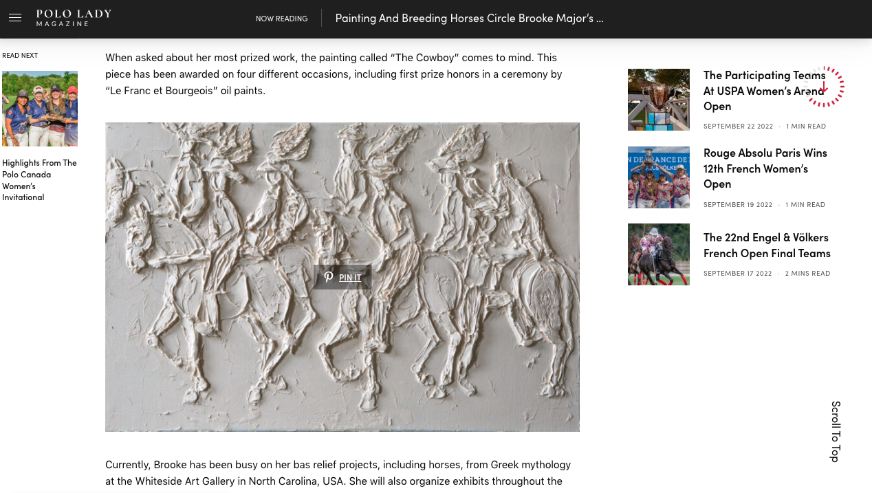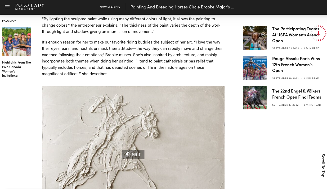 Ses peintures d'équidés, qui confinent à la sculpture par le relief que l'artiste leur donne, lui ont demandé six mois de travail. « Je voulais que ce soit parfait », lâche-t-elle. Arrivée en France il y a 17 ans, celle qui voulait être éleveuse depuis qu'elle avait trois ans a aujourd'hui atteint son but. « Ma mère ne voulait pas que je sois artiste, donc j'ai fait Sciences Po Paris. Mais je voulais faire des tableaux et des chevaux », confie-t-elle.