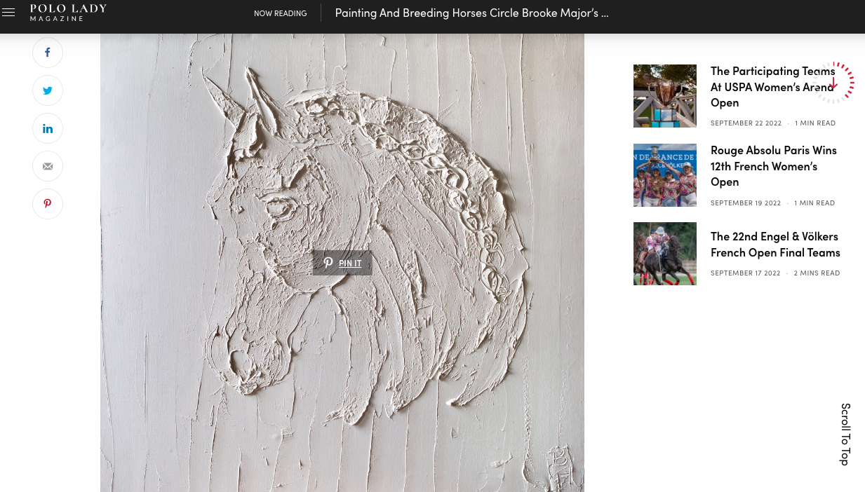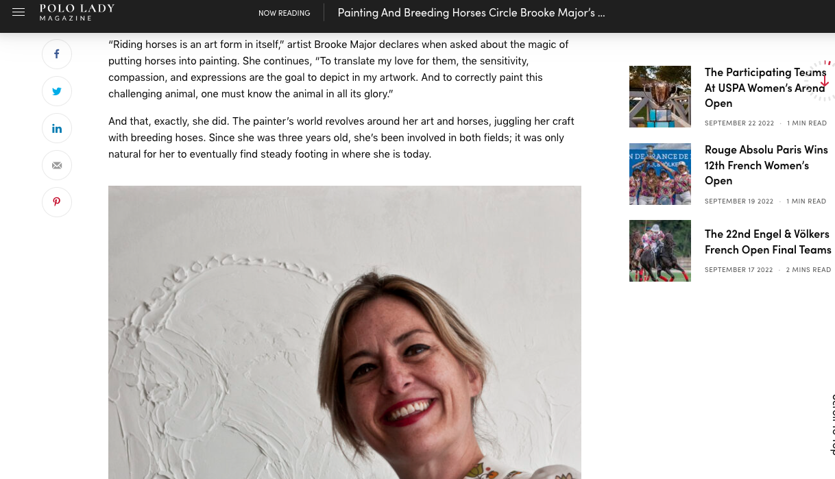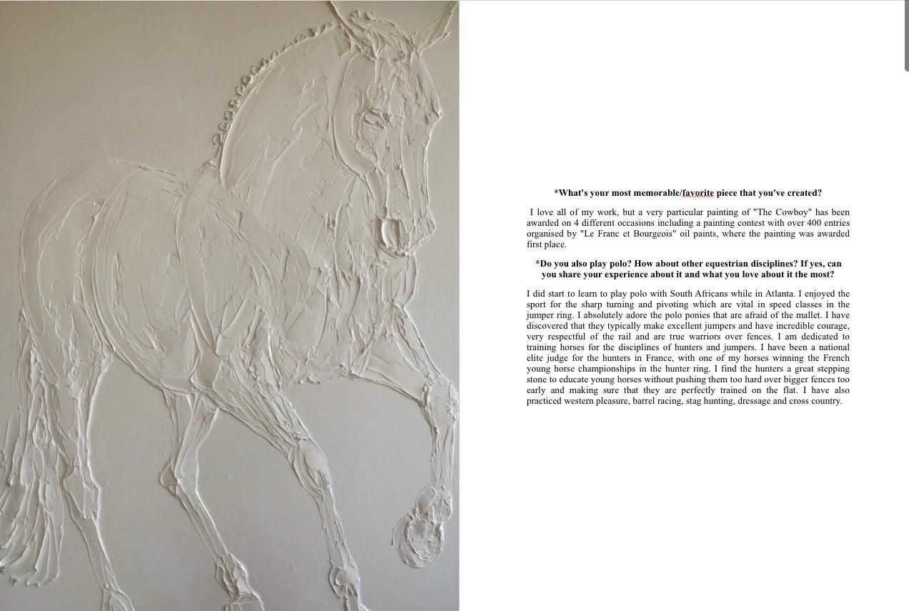 Ses peintures d'équidés, qui confinent à la sculpture par le relief que l'artiste leur donne, lui ont demandé six mois de travail. « Je voulais que ce soit parfait », lâche-t-elle. Arrivée en France il y a 17 ans, celle qui voulait être éleveuse depuis qu'elle avait trois ans a aujourd'hui atteint son but. « Ma mère ne voulait pas que je sois artiste, donc j'ai fait Sciences Po Paris. Mais je voulais faire des tableaux et des chevaux », confie-t-elle.