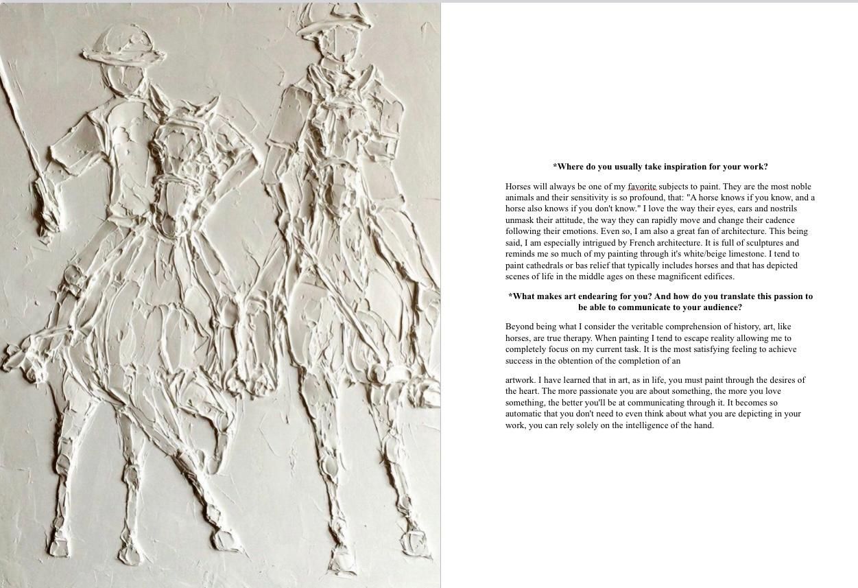 Sa méthode de travail ? Une toile, l'application d'un fond blanc, qu'elle laisse sécher, avant de développer un bas-relief avec des petits outils de sculpteur. En ressortent les contours, grâce aux jeux de lumière, d'un cheval au galop, des gros plans ou encore un match de polo. Des oeuvres plus communes, en couleur, sont également visibles dans cette exposition dominée par le blanc.